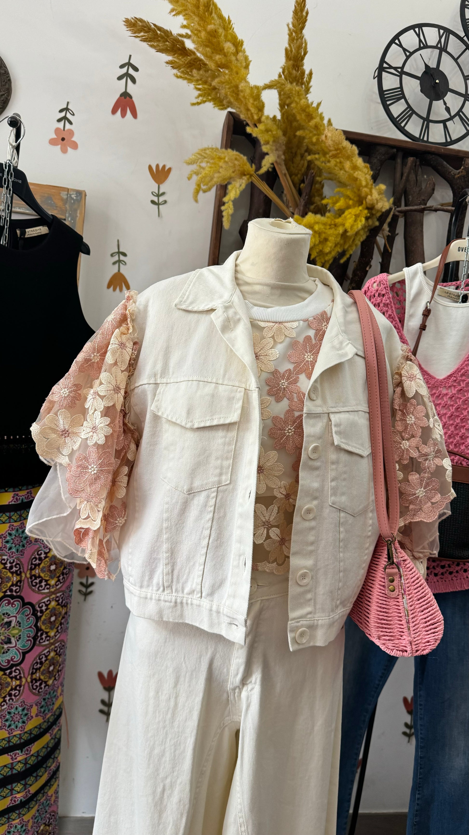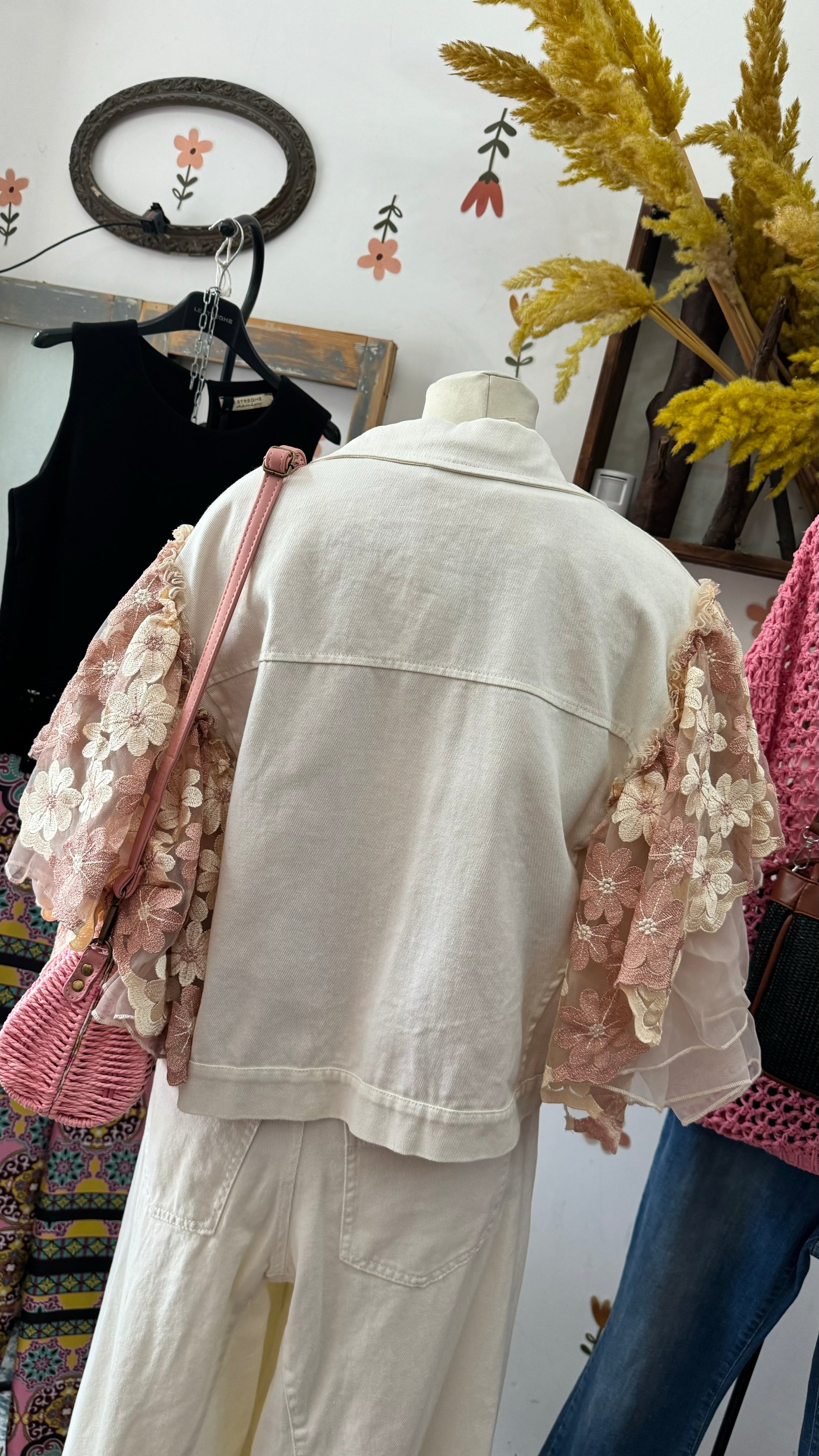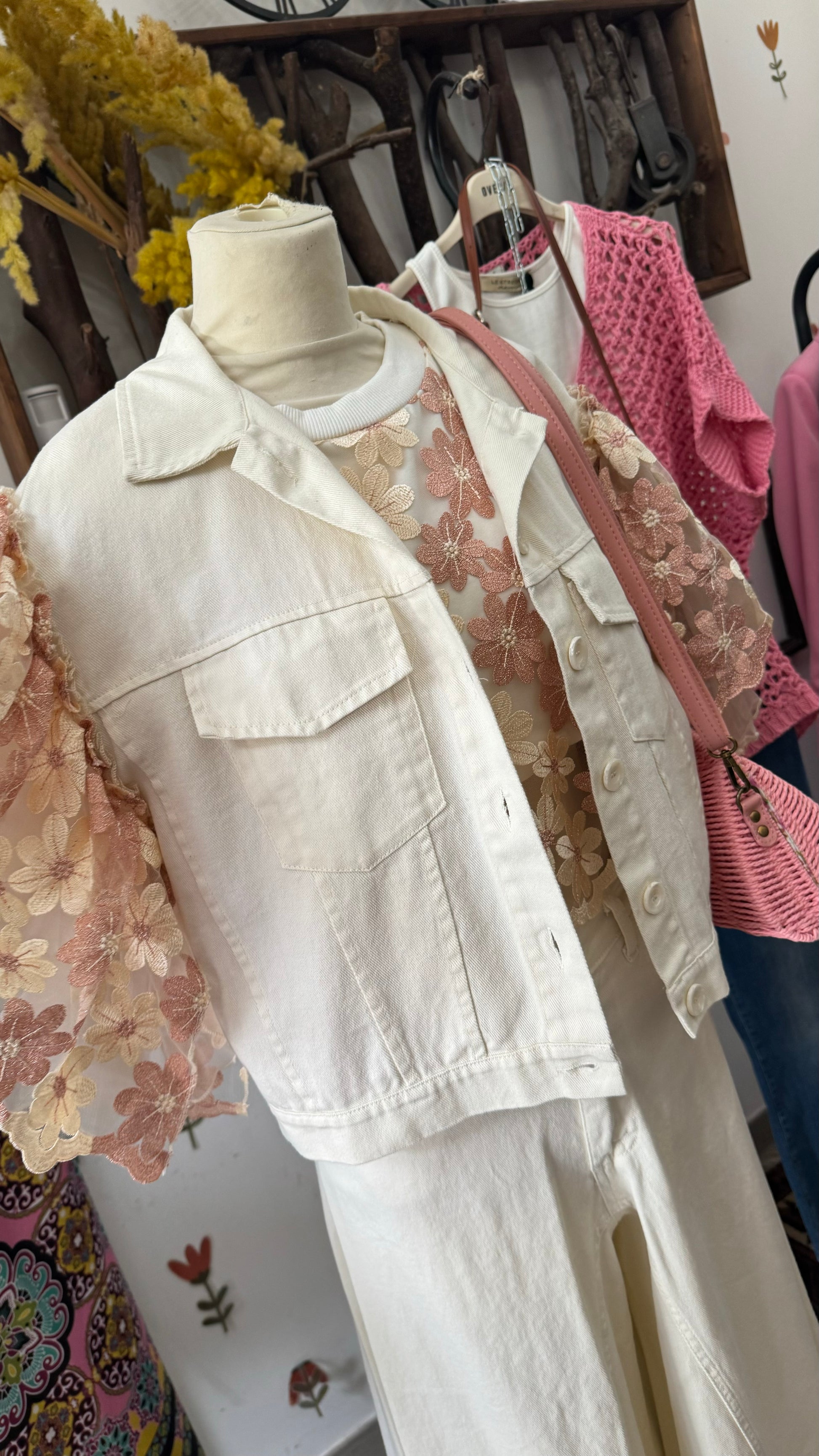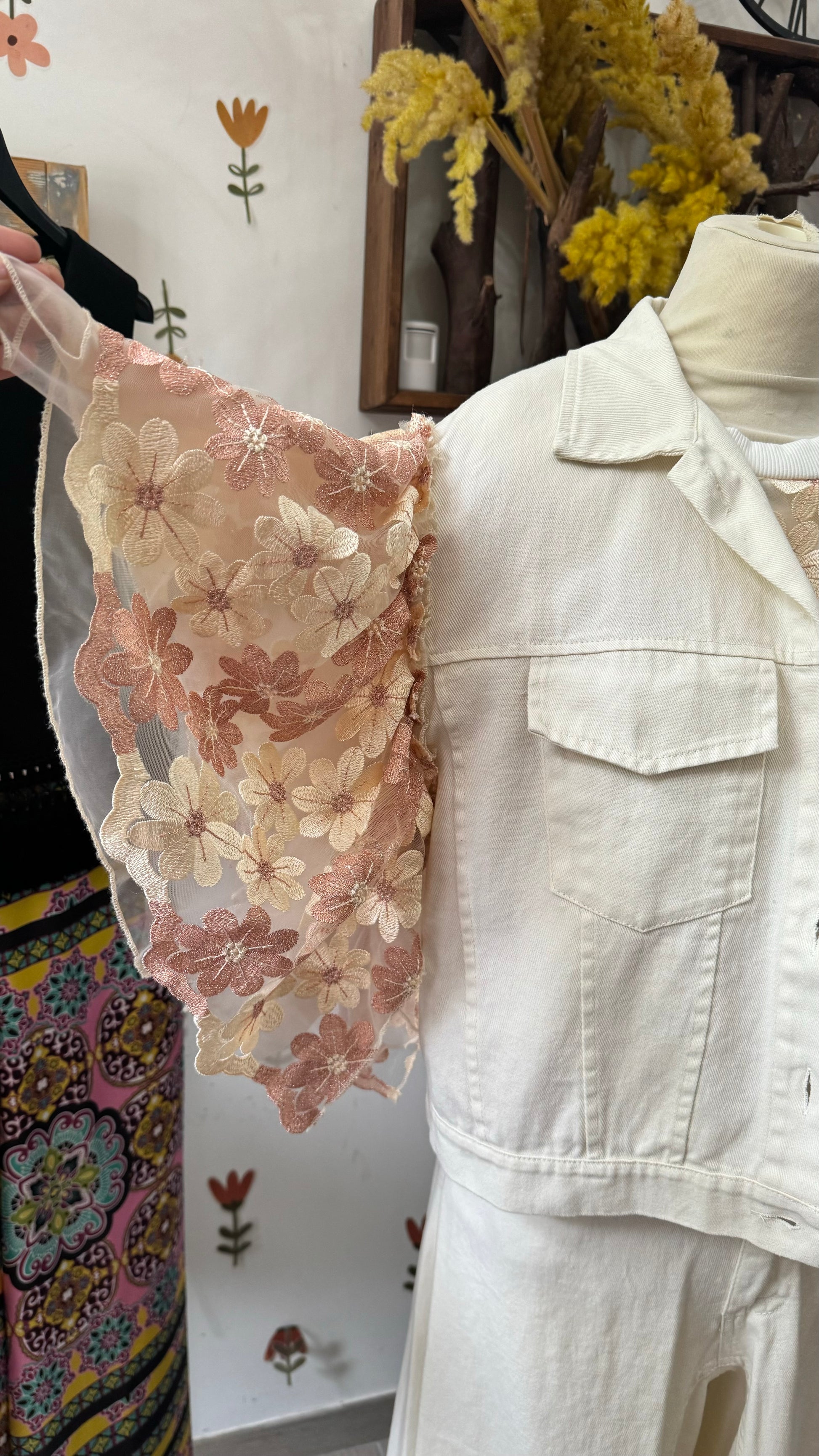 Giacca in cotone con toulle e fiori applicati sulle maniche