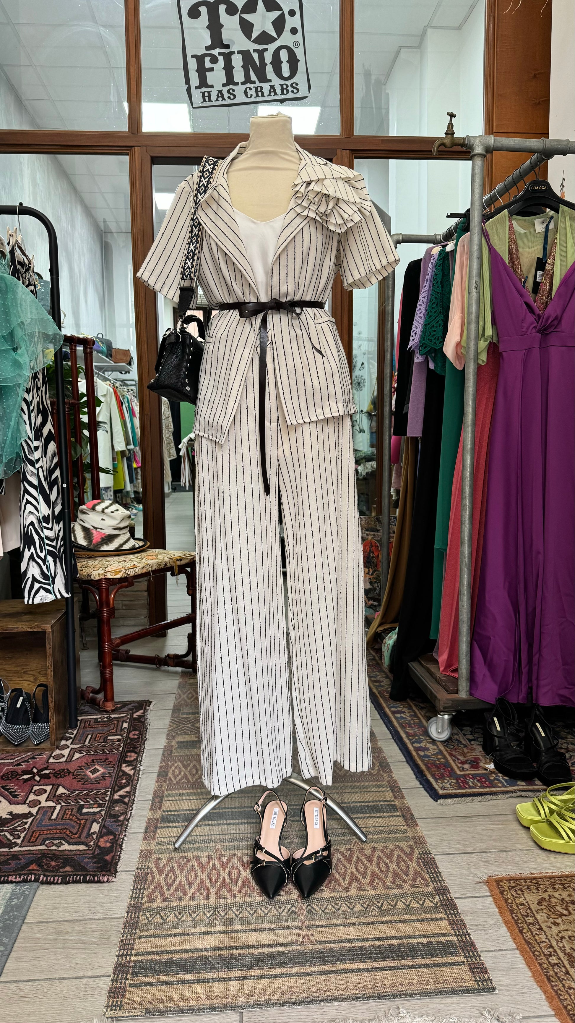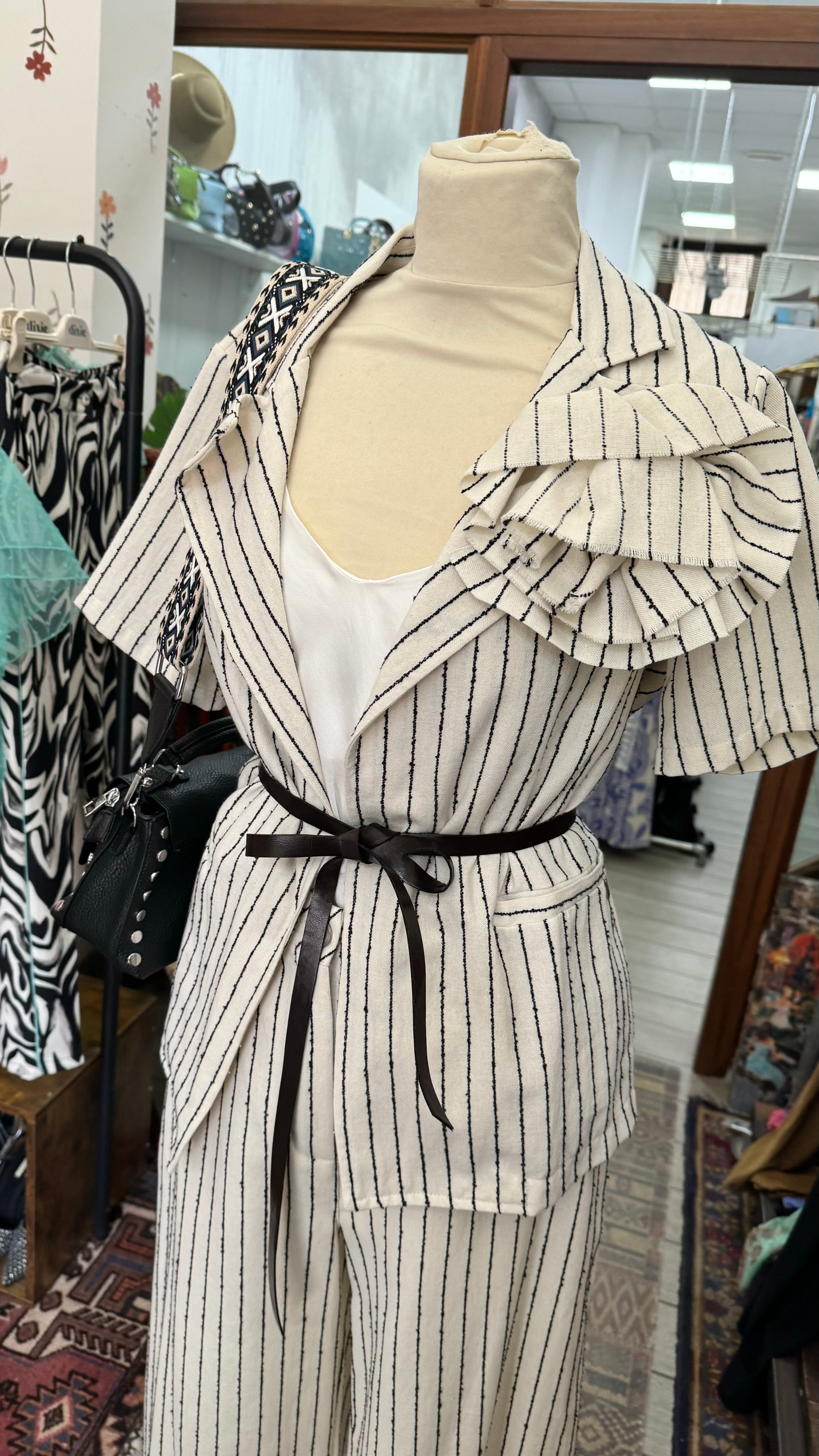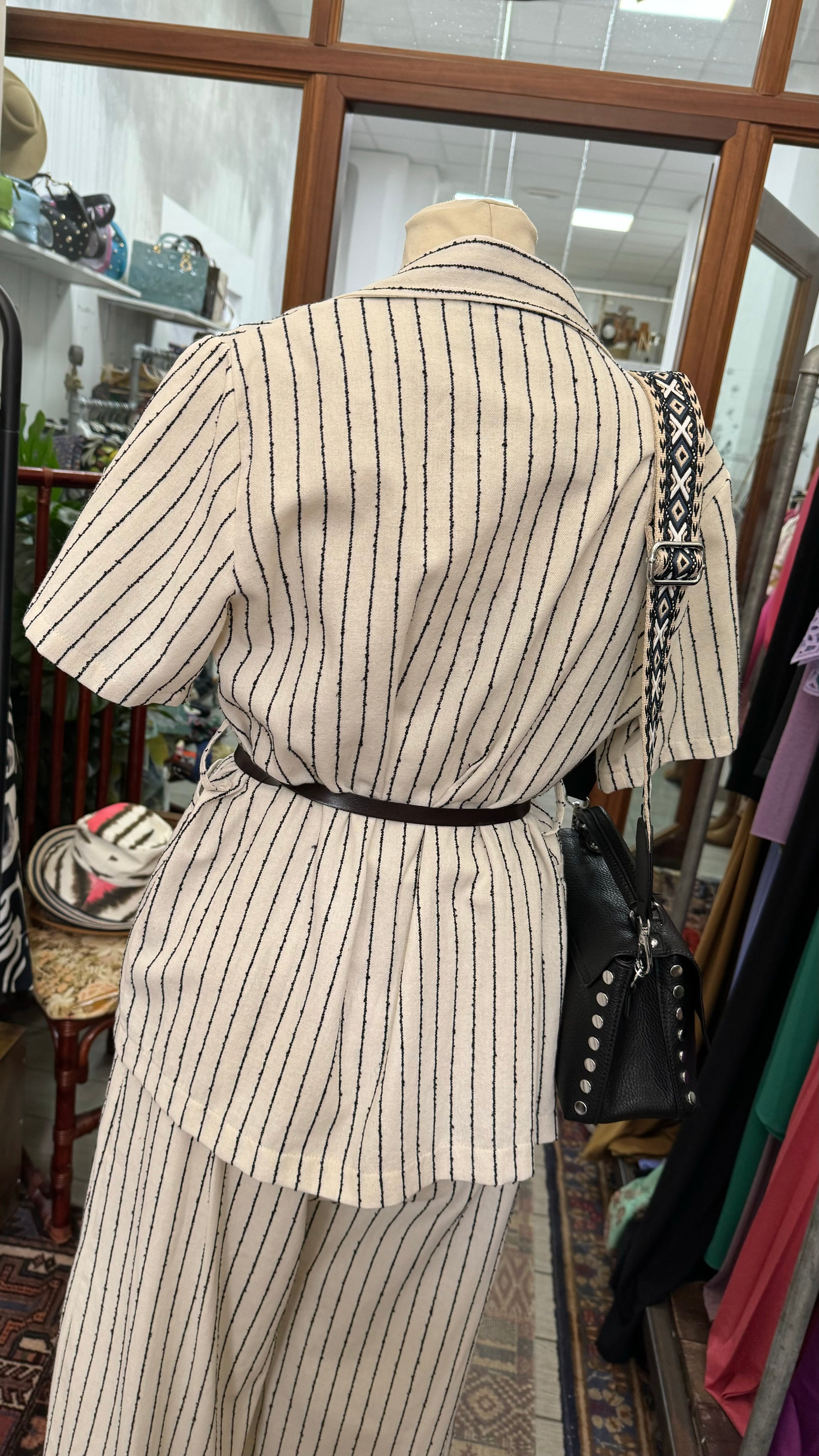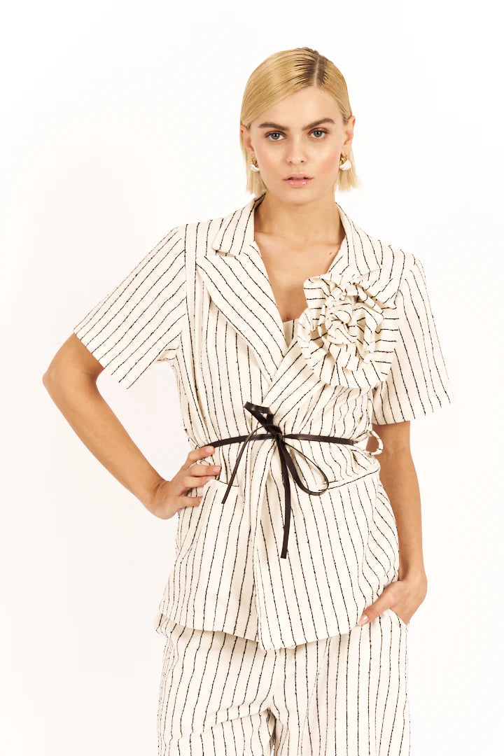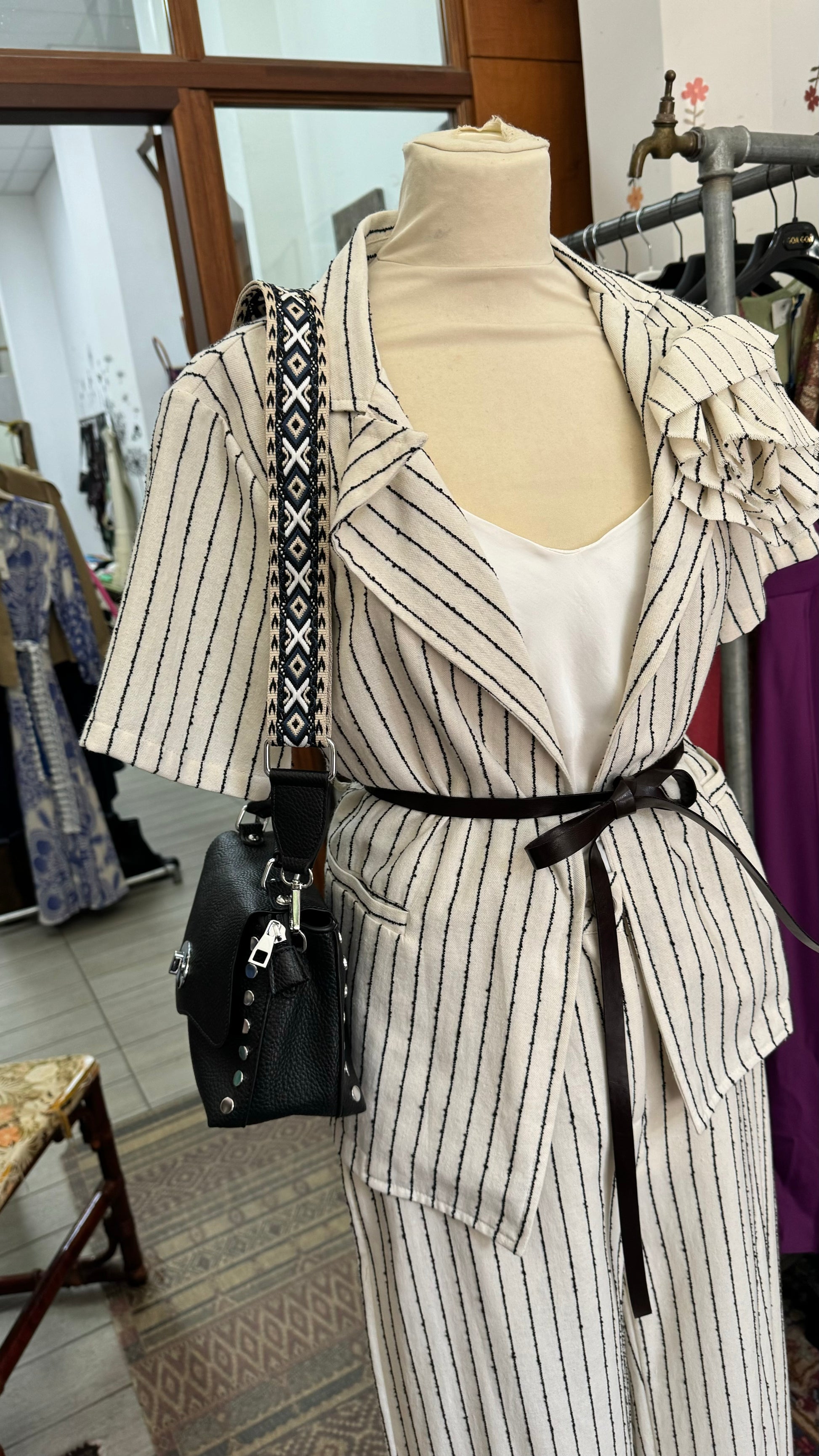 Giacca gessata con cintura e spilla
