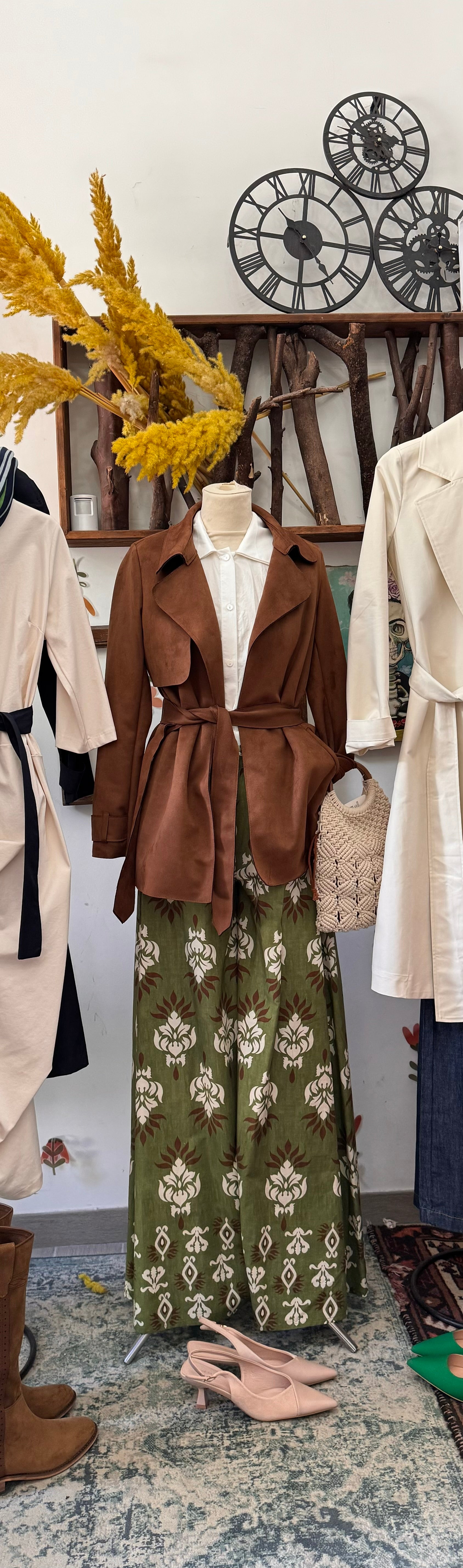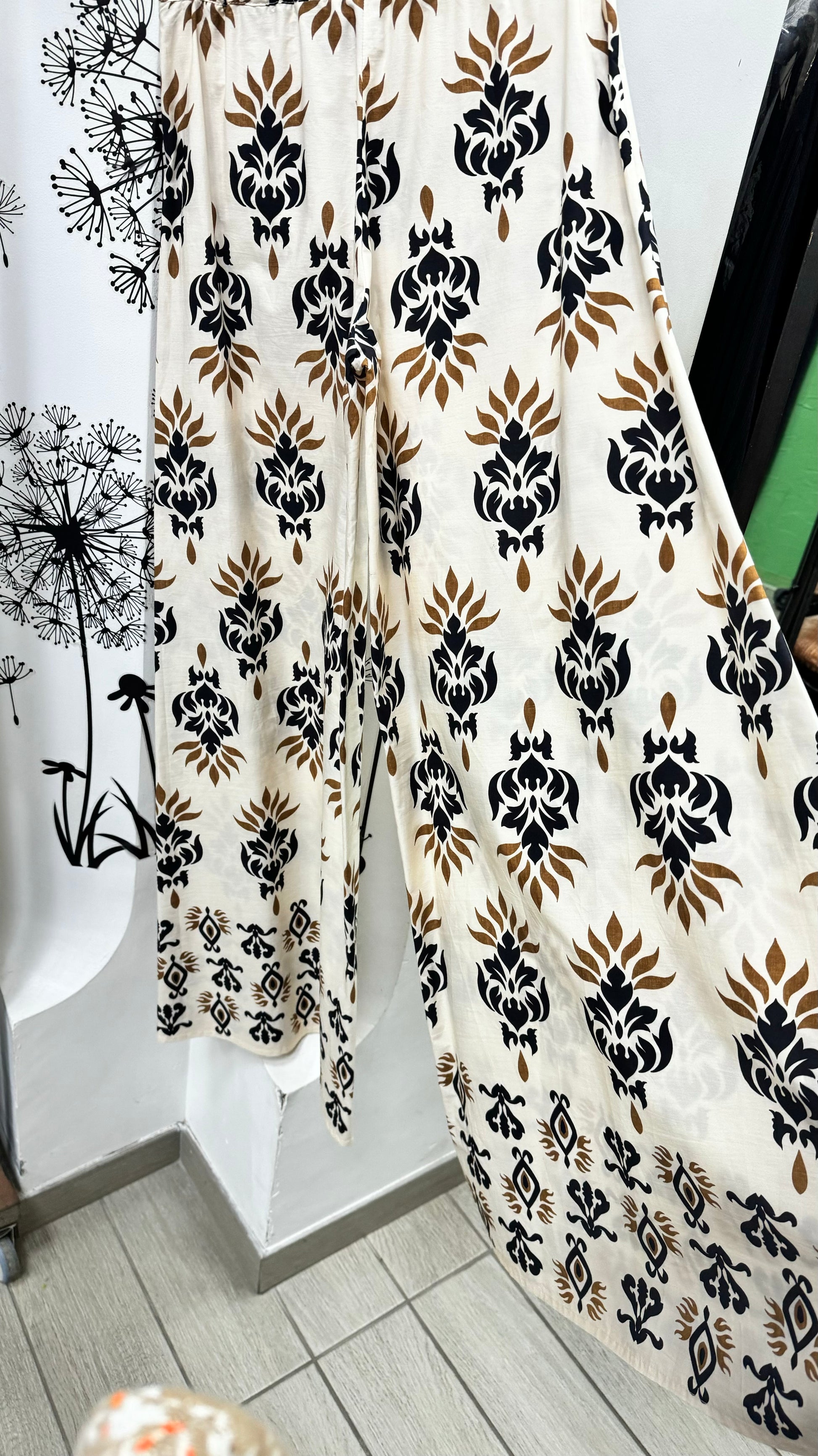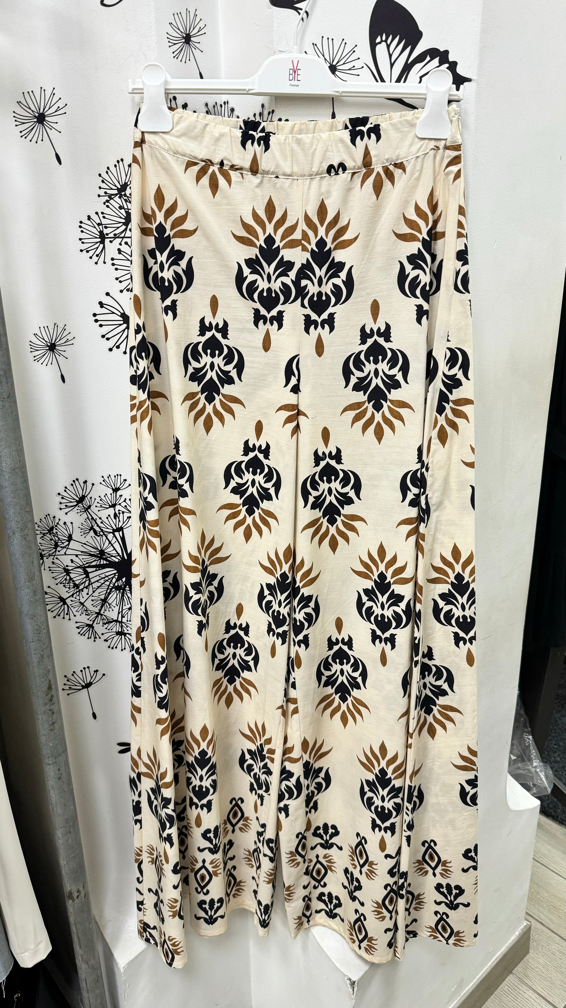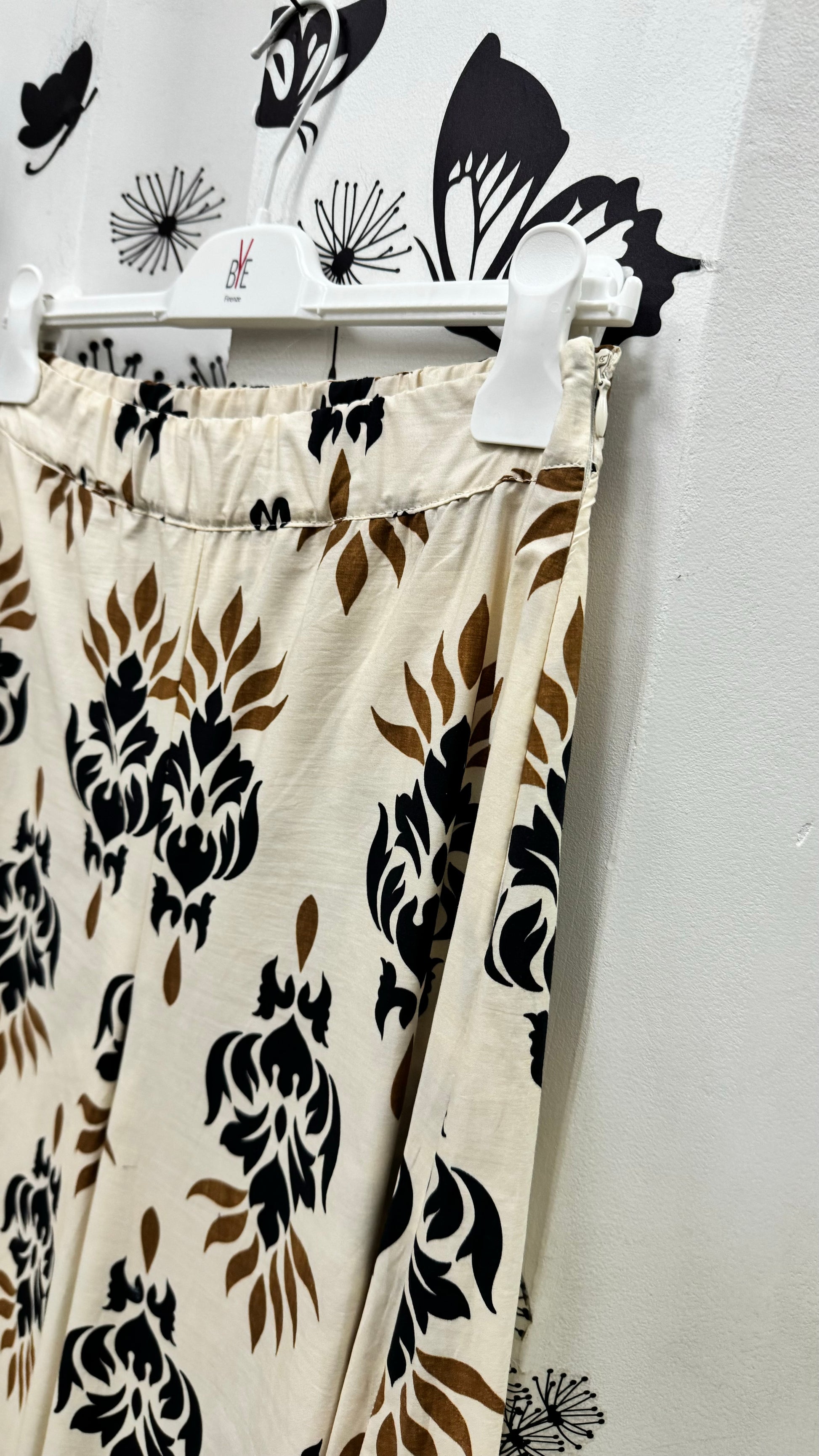 Panta palazzo fantasia fiori . Gamba larga , zip laterale , elastico in vita . Vestibilita regolare e confortevole . 100% cotone